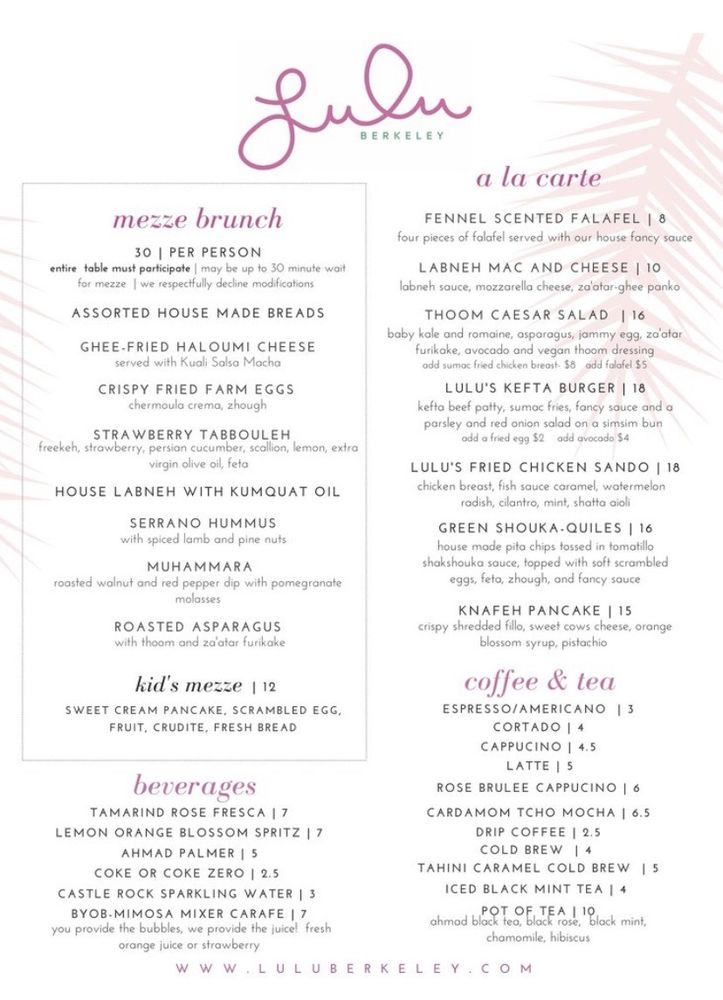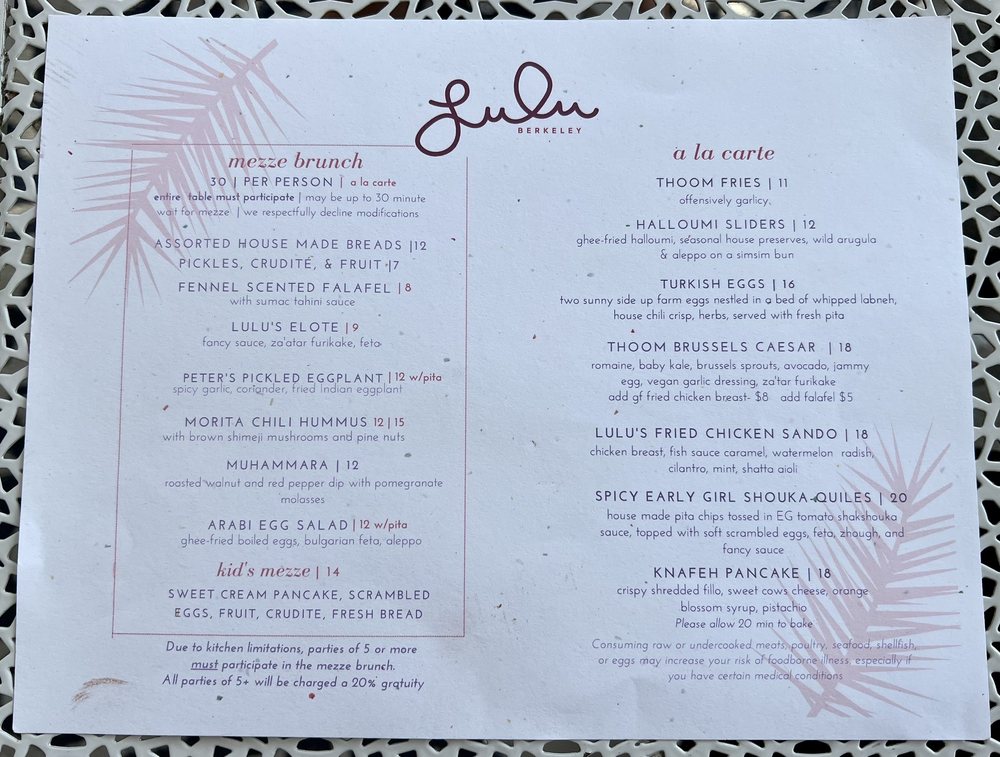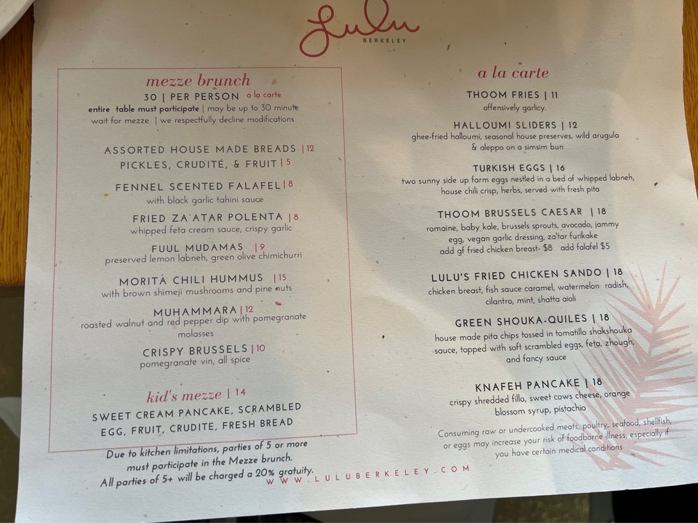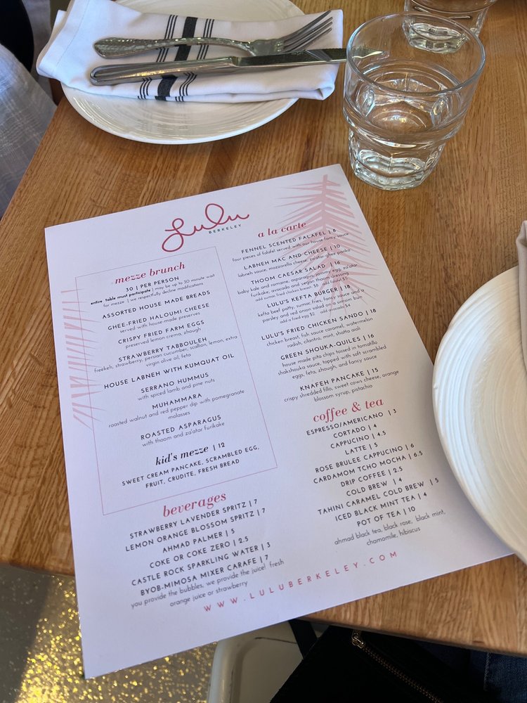 Located in Albany, CA, Lulu Berkeley offers a trendy and intimate Middle Eastern breakfast and brunch experience that caters to various dietary preferences with vegan and vegetarian options. With its hipster vibe and casual atmosphere, this spot is perfect for a group lunch or a romantic meal. The menu features a range of dishes, from the flavorful Baba's Breakfast to the indulgent NY Steak with Amarosa Potato chips. Don't miss out on the unique Loaded Fries with Toum fries, braised lamb, and chili crisp, or the Mezze Sampler for a taste of different Middle Eastern flavors. Whether you're in the mood for a light Citrus Salad or a hearty Lentil Stew, Lulu Berkeley has something for everyone. Call ahead for a reservation or take advantage of their delivery and takeout options to enjoy their delicious offerings at home.